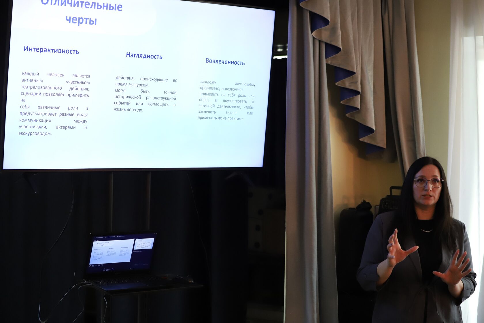 Мы представили иммерсивные технологии, которые активно используем уже не первый год. Они помогают сделать мероприятия интереснее и ярче – ведь участники могут погрузиться в определенную историческую эпоху, время или место